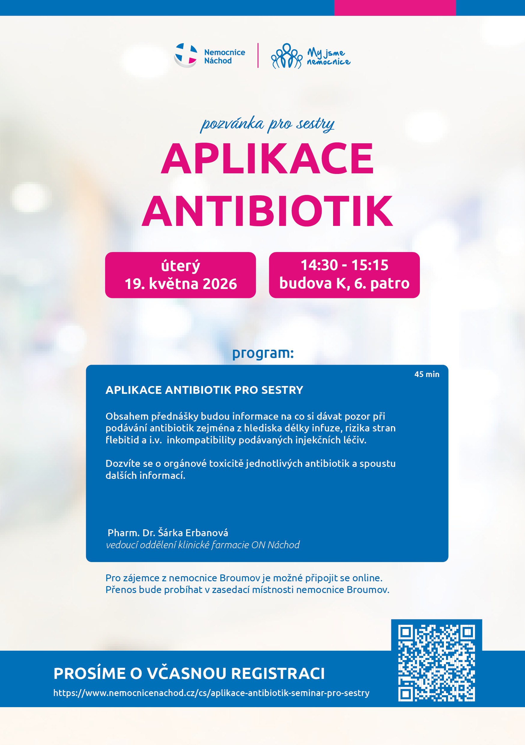 Přednášející: Pharm. Dr. Šárka Erbanová - vedoucí oddělení klinické farmacie ON Náchod