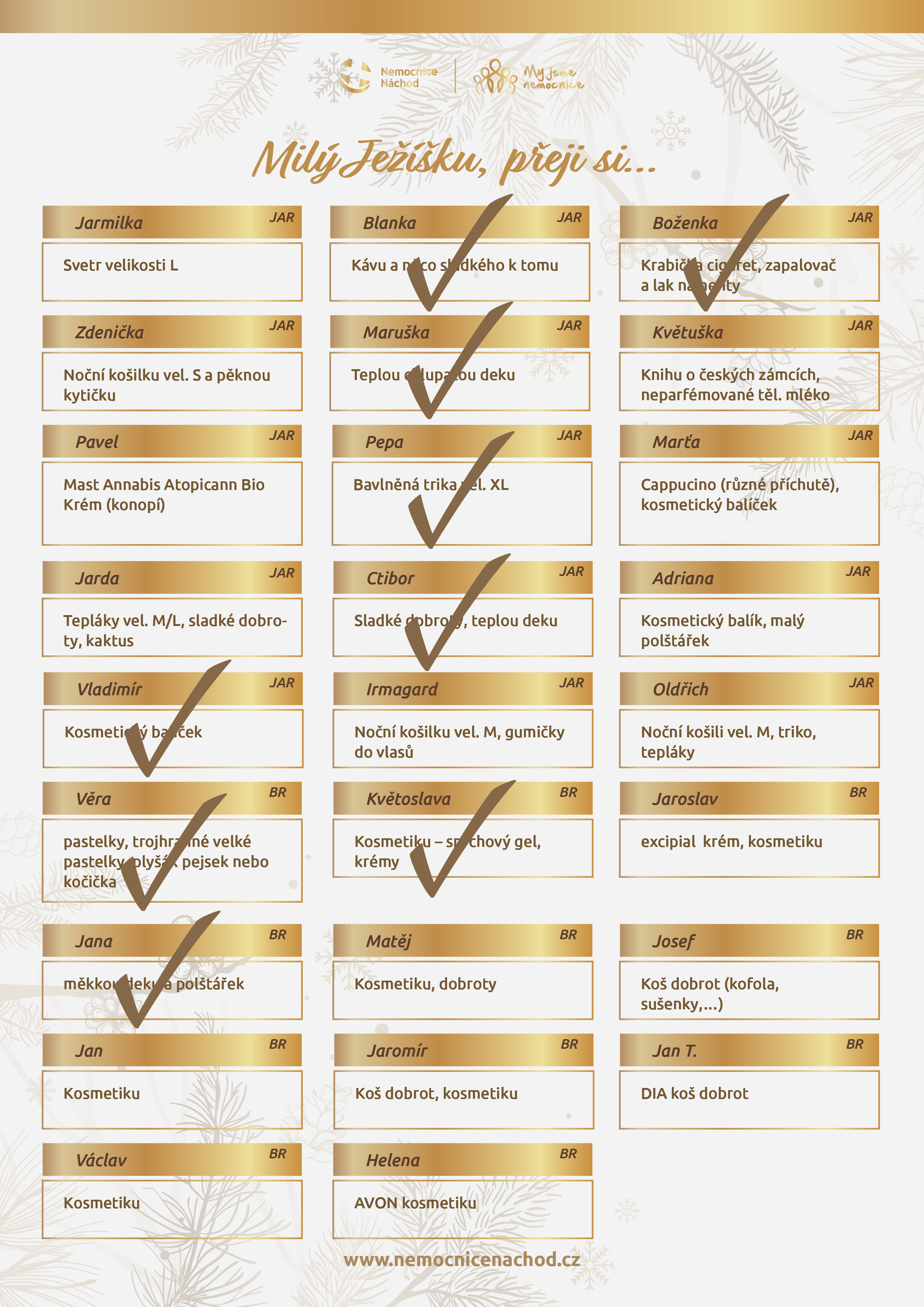Mnohá přání jsou tichá, skromná a často velmi dojemná. Nejde o velké věci – naši klienti touží po maličkostech, které jim zpříjemní každodenní život: teplé ponožky, hrneček na čaj, oblíbenou kosmetiku nebo třeba knihu či drobnost, která jim připomene domov. A přesto právě tato přání mají sílu vykouzlit úsměv, vzbudit vzpomínky a dát jasně najevo, že na ně někdo myslí.