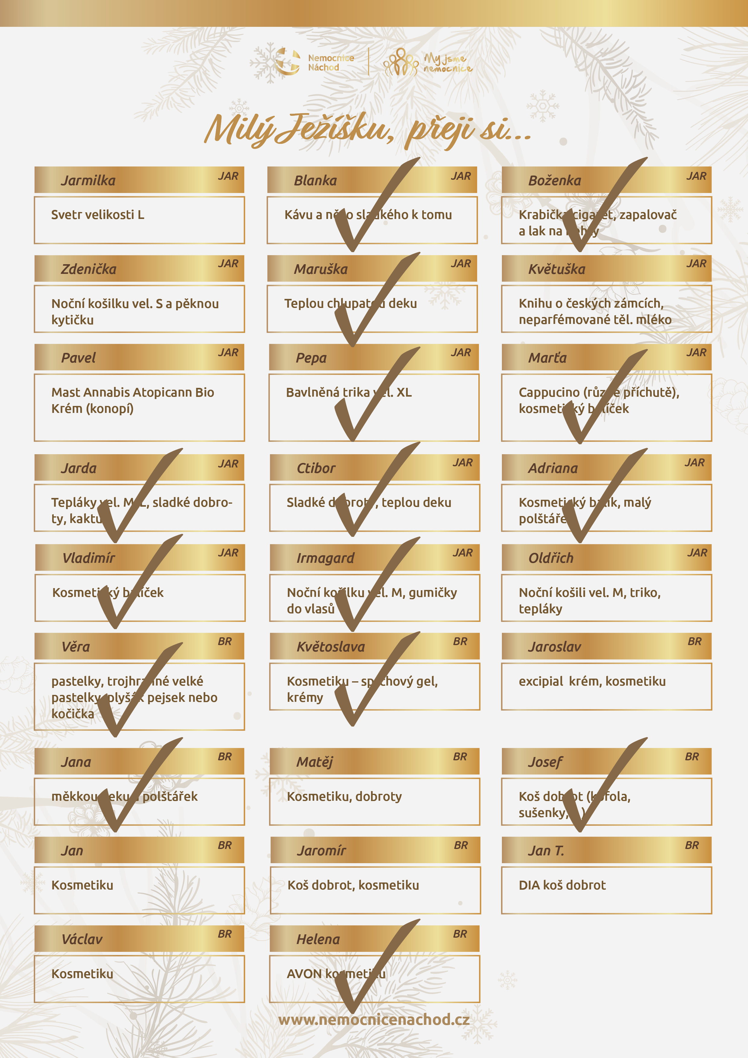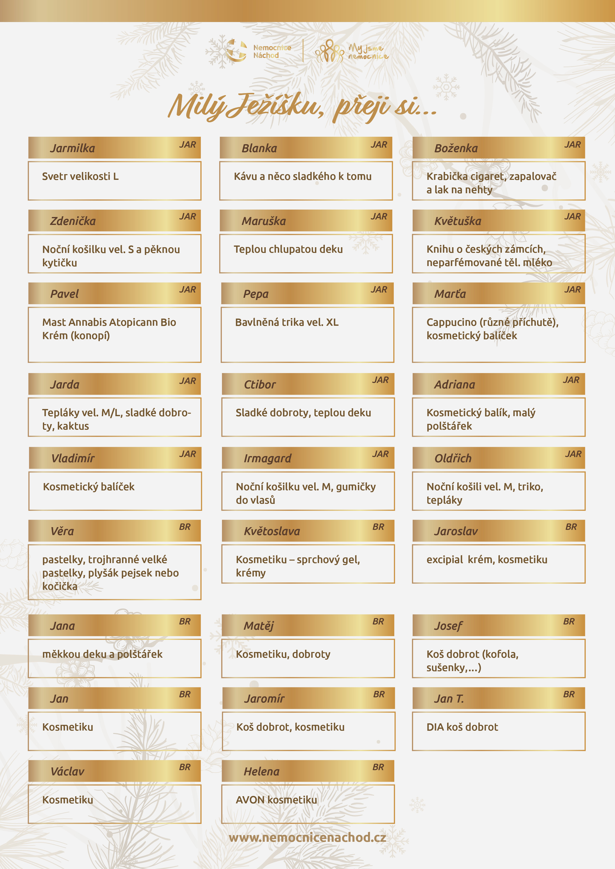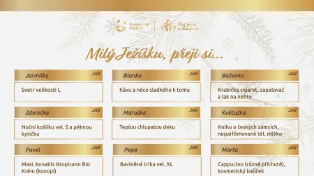 Mnohá přání jsou tichá, skromná a často velmi dojemná. Nejde o velké věci – naši klienti touží po maličkostech, které jim zpříjemní každodenní život: teplé ponožky, hrneček na čaj, oblíbenou kosmetiku nebo třeba knihu či drobnost, která jim připomene domov. A přesto právě tato přání mají sílu vykouzlit úsměv, vzbudit vzpomínky a dát jasně najevo, že na ně někdo myslí.