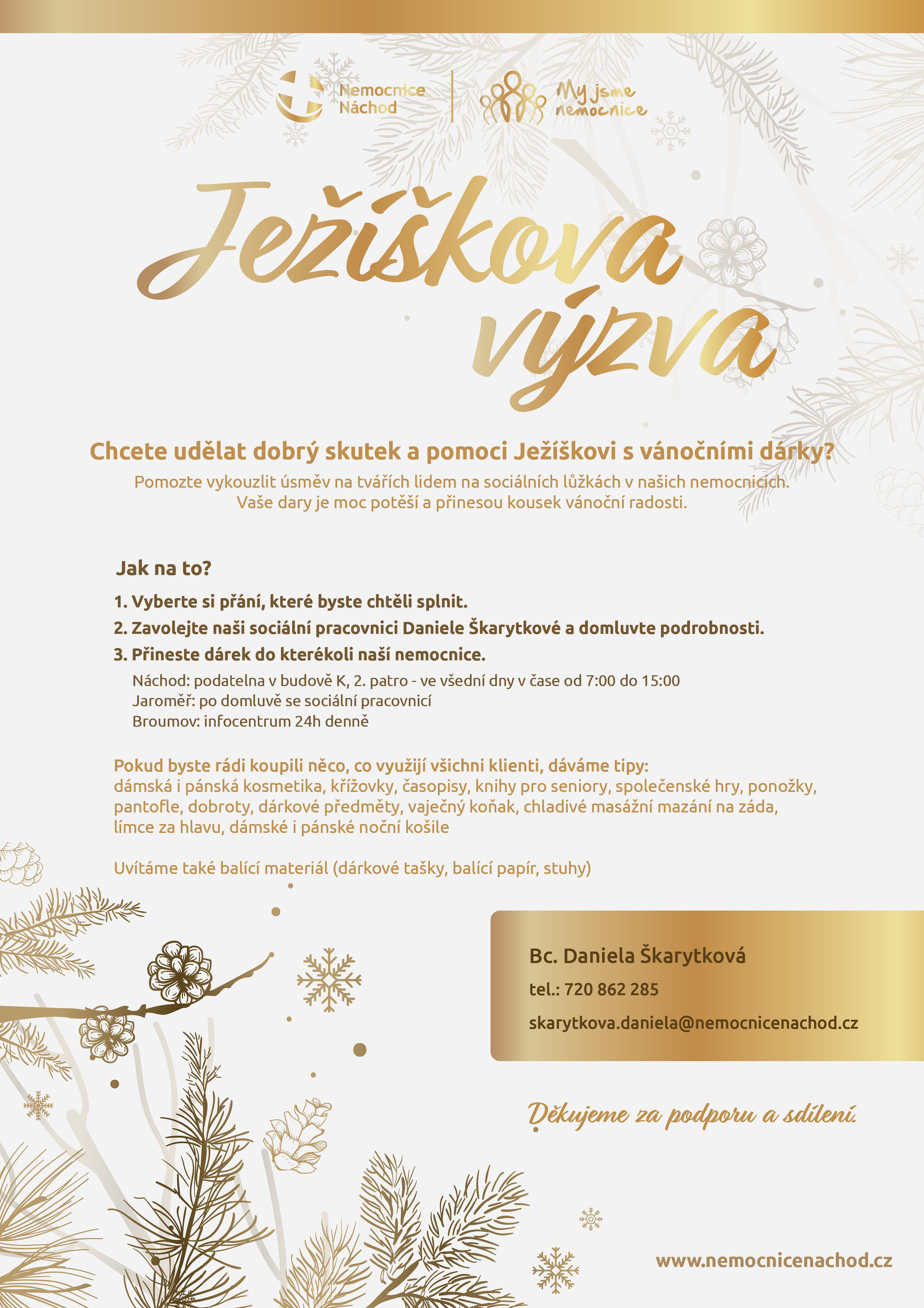 Blíží se čas Vánoc – období, kdy si přejeme obdarovávat, těšit druhé a přinášet do života lidí kousek světla. V naší nemocnici jsme se i letos rozhodli uspořádat Ježíškovu výzvu, která pomáhá splnit drobná vánoční přání klientů na sociálních lůžkách.