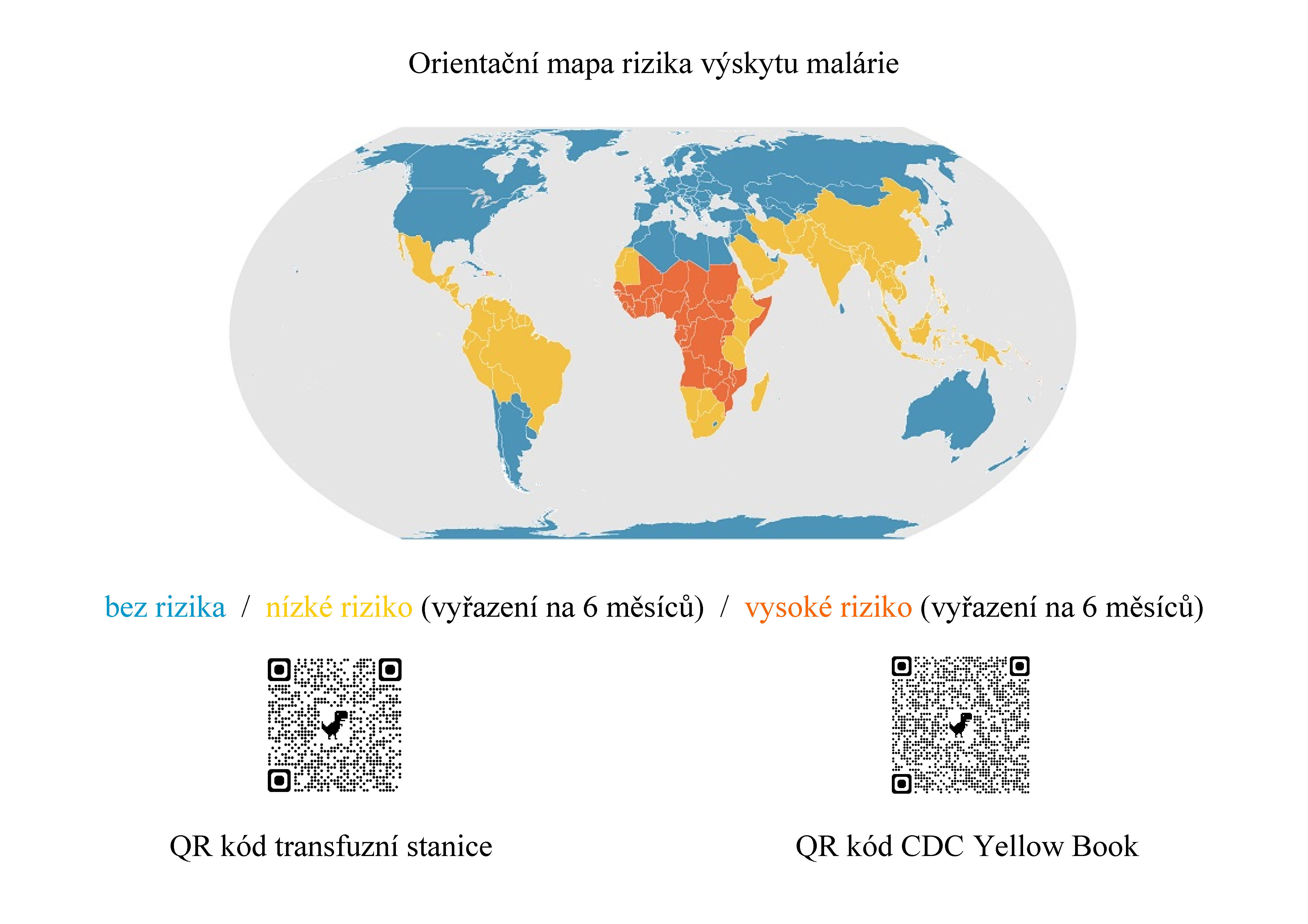 zemí). - Vyřazení na 6 měsíců po návratu z oblastí s výskytem malárie (na webové stránce transfuzní stanice ON Náchod a.s. najdete odkaz na on-line aplikaci CDC Yellow Book, kde lze vyhledávat jednotlivé země s uvedením údaje o výskytu malárie). V případě preventivního užívání antimalarik je vyřazení z darování na 1 rok. Pro rychlý přístup na webové stránky lze využít QR kódy na druhé straně.