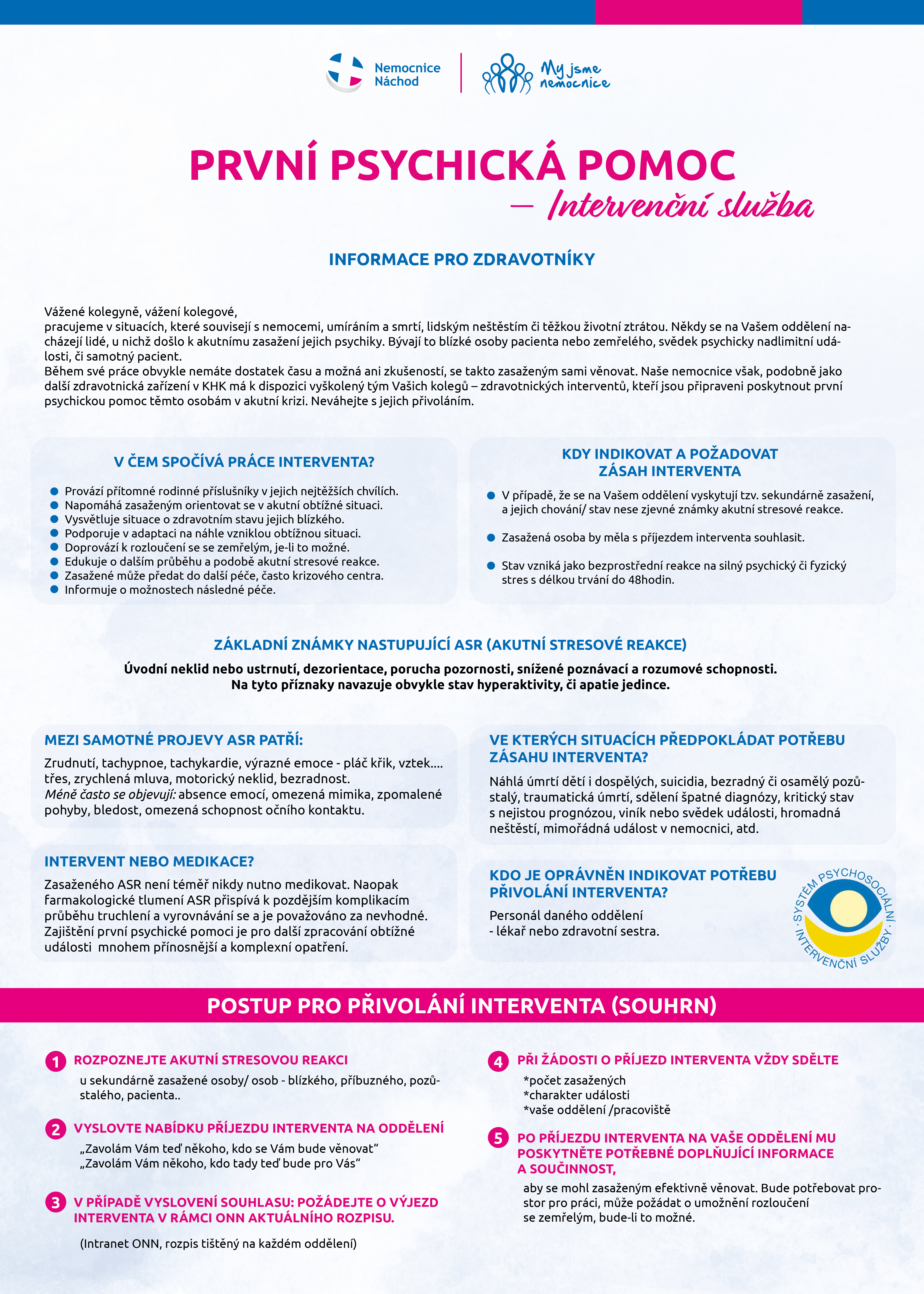 Během své práce obvykle nemáte dostatek času a možná ani zkušeností, se takto zasaženým sami věnovat. Naše nemocnice však, podobně jako další zdravotnická zařízení v KHK má k dispozici vyškolený tým Vašich kolegů – zdravotnických interventů, kteří jsou připraveni poskytnout první psychickou pomoc těmto osobám v akutní krizi. Neváhejte s jejich přivoláním.