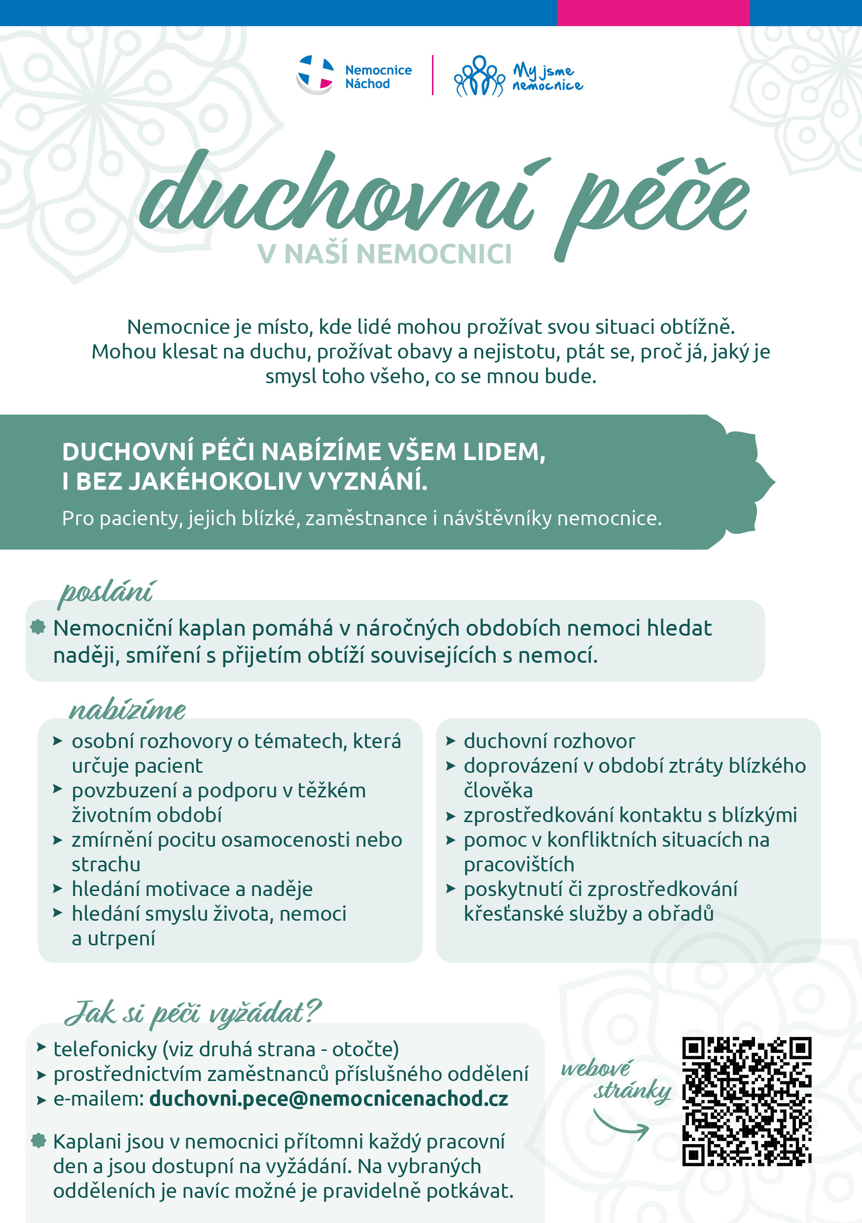 Duchovní péči nabízíme všem lidem, i bez jakéhokoliv vyznání. Pro pacienty, jejich blízké, zaměstnance i návštěvníky nemocnice. – Duchovní péče je součástí komplexní péče o člověka. Odpovídá na spirituální potřeby člověka, které má každý bez rozdílu vyznání nebo náboženské příslušnosti – K právům pacienta patří přijímat ve zdravotnickém zařízení lůžkové nebo jednodenní péče duchovní péči a duchovní podporu od osob pověřených výkonem duchovenské činnosti. – „Nemocniční kaplan“ je mezinárodní označení osoby, která vykonává duchovní péči ve zdravotnických, příp. sociálních službách a hospicích. Při své práci je kaplan vázán mlčenlivostí a Etickým kodexem nemocničního kaplana.